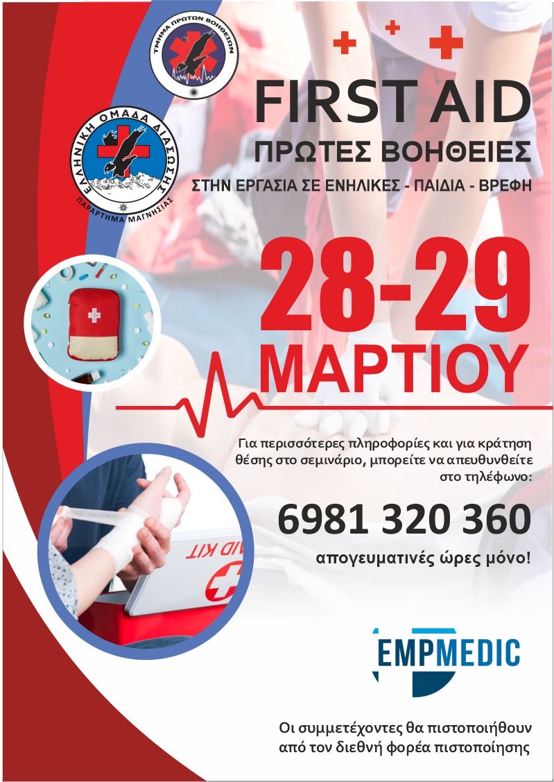 Η Ελληνική Ομάδα Διάσωσης Μαγνησίας διοργανώνει ένα πλήρες & πιστοποιημένο σεμινάριο Πρώτων Βοηθειών, υπό την αιγίδα του διεθνούς οργανισμού EMP Medic First Aid.