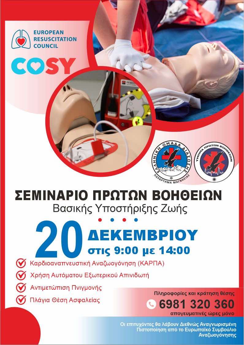 Η Ελληνική Ομάδα Διάσωσης Μαγνησίας, διοργανώνει στις 20/12/2025 και ώρες 09:00 - 14:00 πιστοποιημένο σεμινάριο Πρώτων Βοηθειών - Βασικής Υποστήριξης Ζωής διάρκειας 5 ωρών υπό την αιγίδα του Ευρωπαϊκού Συμβουλίου Αναζωογόνησης (ERC).
