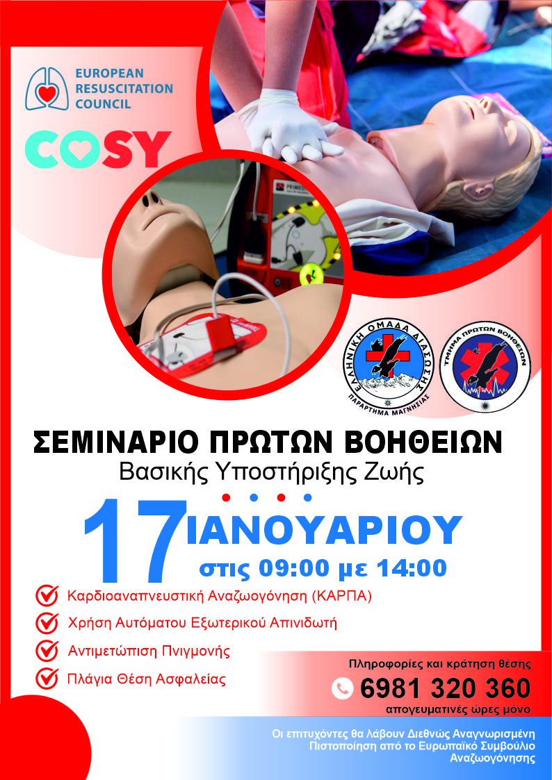 Η Ελληνική Ομάδα Διάσωσης Μαγνησίας, διοργανώνει στις 17/01/2026 και ώρες 09:00 - 14:00 πιστοποιημένο σεμινάριο Πρώτων Βοηθειών - Βασικής Υποστήριξης Ζωής διάρκειας 5 ωρών υπό την αιγίδα του Ευρωπαϊκού Συμβουλίου Αναζωογόνησης (ERC).