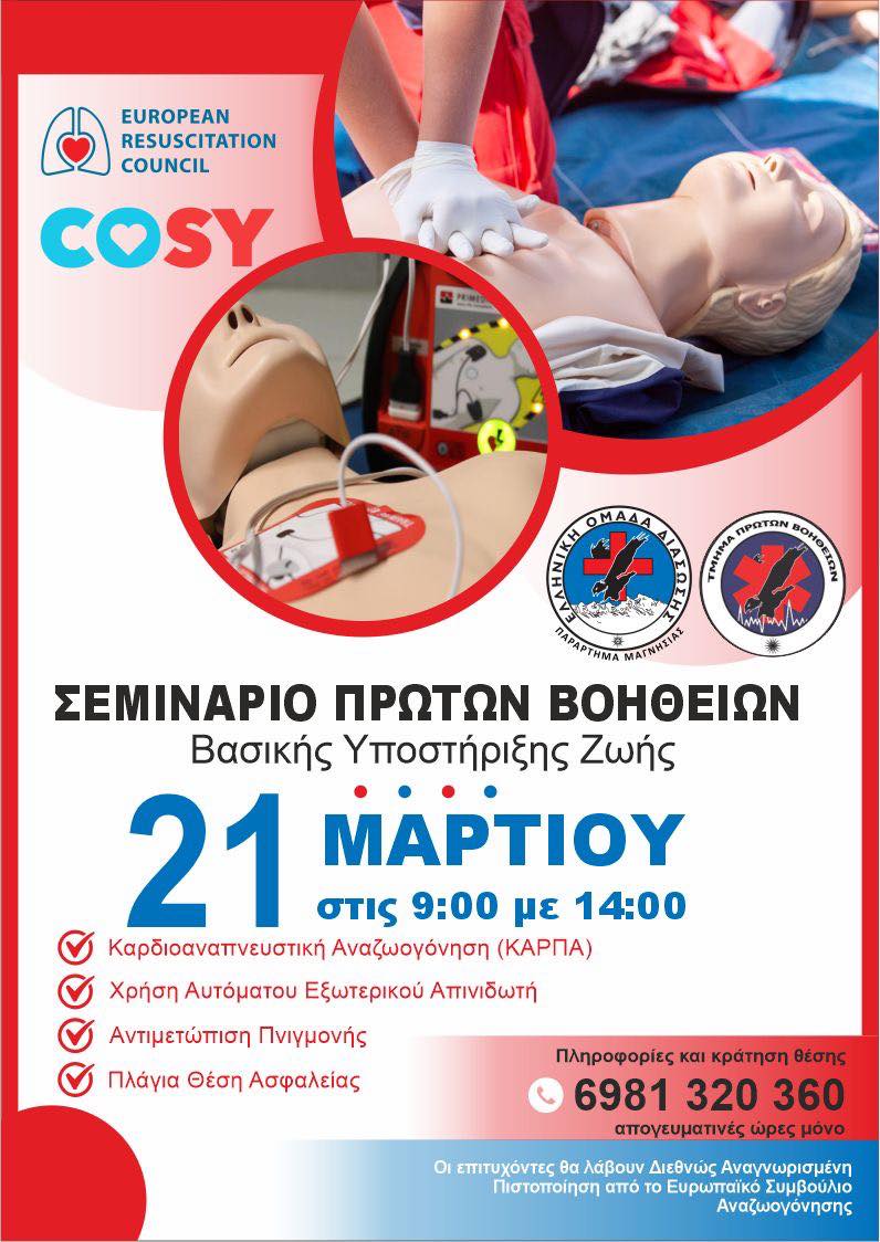 Η Ελληνική Ομάδα Διάσωσης Μαγνησίας σε καλεί σε ένα ολοκληρωμένο, πιστοποιημένο σεμινάριο Πρώτων Βοηθειών – Βασικής Υποστήριξης Ζωής (BLS), υπό την αιγίδα του ERC.